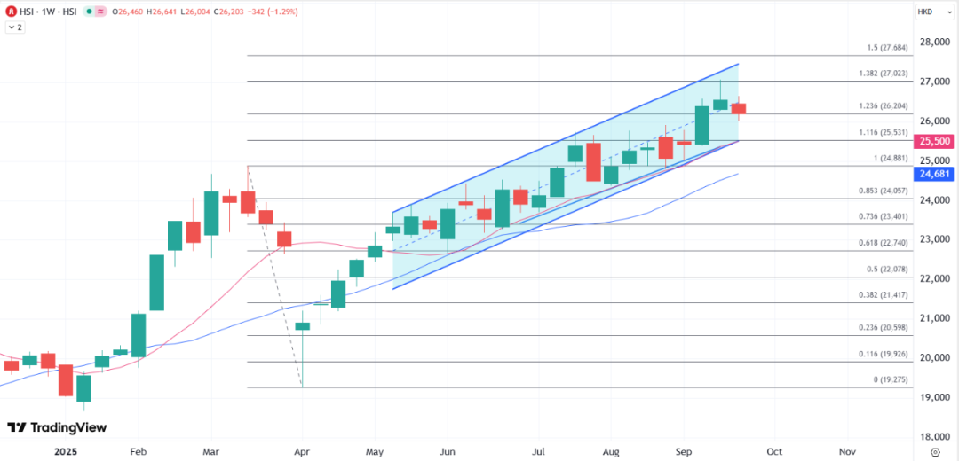 港股本周周线提前锁定了三周来的首次下跌,在此前连番刷高后港股暂时修正,重新待科技股动力,当前恒指调整关注周线图来自10日均线和上行通道底部的共同支撑在25500附近,有望缓和当前的调整压力,如果借此回升将再次挑战27000关口。