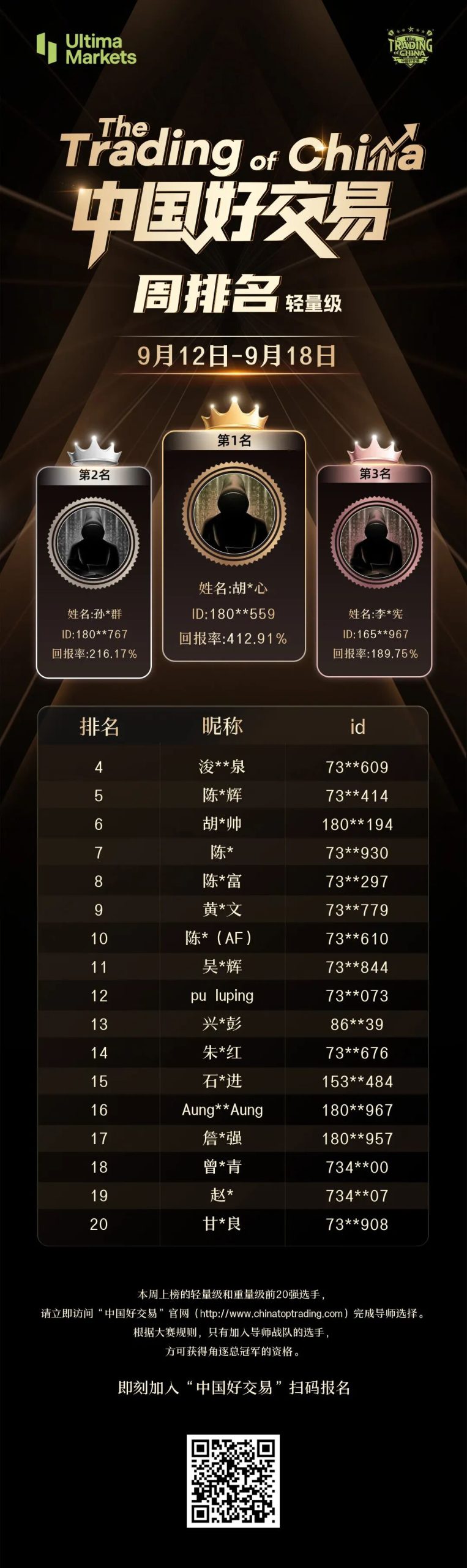 在刚刚公布的“中国好交易”9月第三周(9月12日–9月18日)赛事榜单中,一位年仅20岁的大学生交易员“胡萝卜”,以412.91%的周回报率一举夺得轻量级周冠军,成为本期最耀眼的新星。