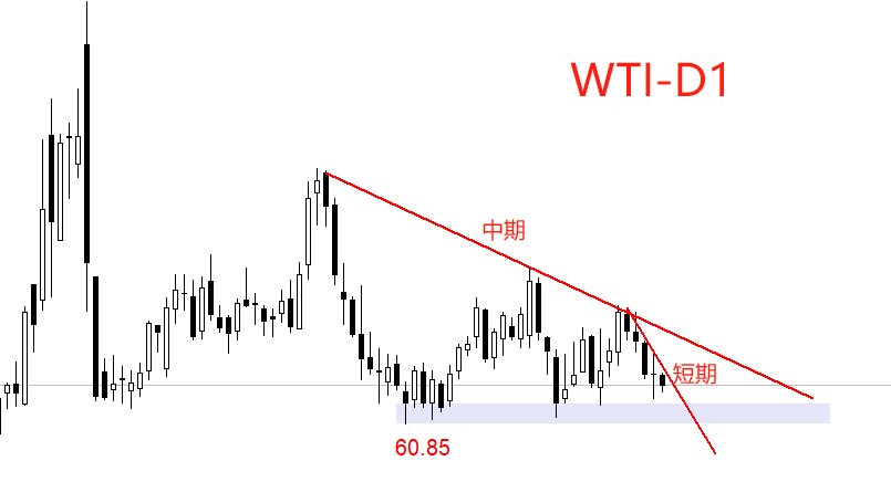 技术走势看,美原油WTI处于中长期空头趋势,但下方存在明显的强支撑区域,K线在60.85紫色区域处形成多重底部。中期趋势线依旧对反弹波段具有压制作用,在该趋势线被有效突破之前,不建议贸然看多。WTI五连跌后形成短期下降趋势线,虽然昨日形成十字星反转结构,但在短期趋势线被破坏之前,跌势仍有望冲击60美元关口。