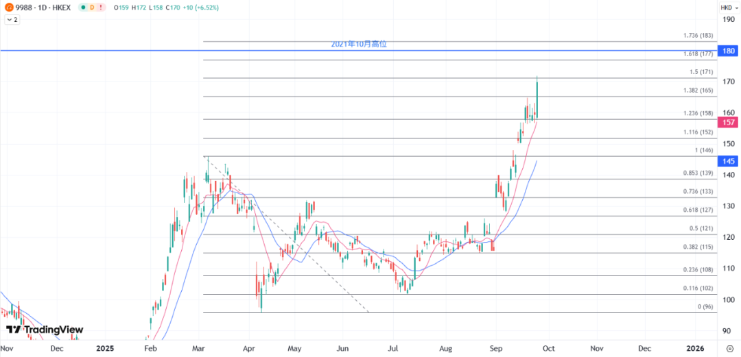 如果阿里巴巴在业务重组、云计算和AI商业化,以及利润增长方面能够交出实实在在的答卷,会有更多国际资本开始重新审视并配置阿里巴巴,为股价的中长期上涨打开空间。当前技术面继续瞄准2011年10月高位180港元为目标,突破的情况下将指向200港元。