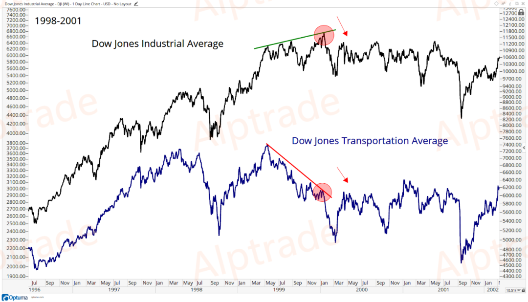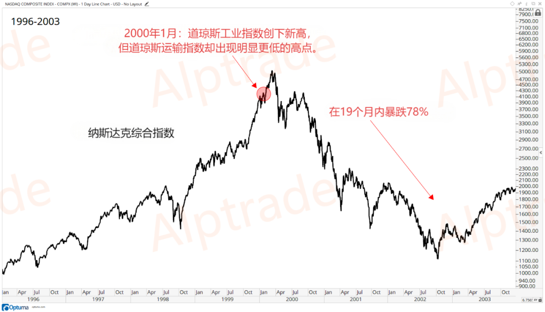 再把时间倒回几年前,你就能看到2000年初发生的情况。就在历史性市场崩盘即将开始之际,道琼斯工业平均指数在新千年的前几周创下了新高,但道琼斯运输指数早已从近期高点下跌了超过16%。这不仅仅是小小的背离,而是一个巨大的信号: