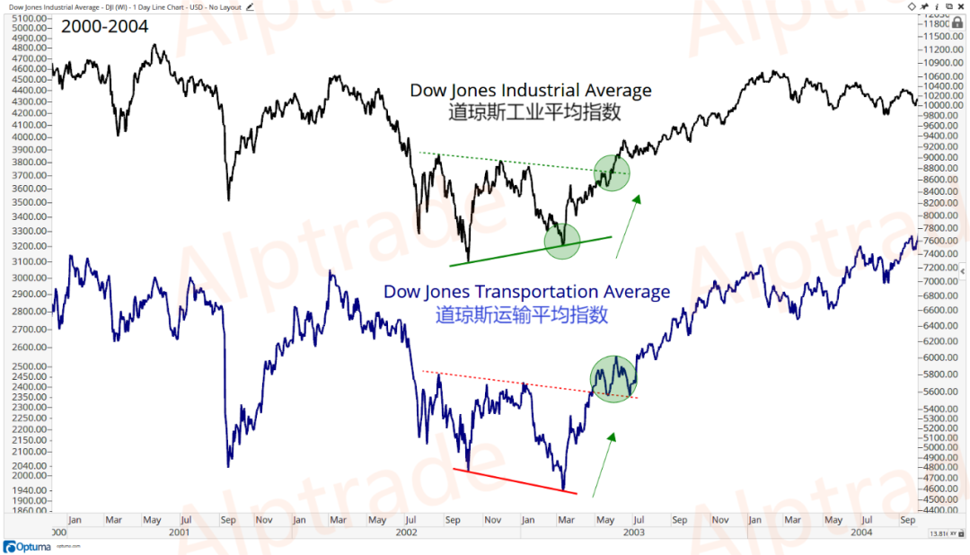 举个例子:在2003年3月,道琼斯运输平均指数创下了更低的新低,而道琼斯工业平均指数却创出了更高的低点。这种看涨的背离表明趋势正在发生变化。不是反转,而是变化。一旦这两个指数在同年5月双双突破各自的盘整区间,就发出了趋势转向上涨的信号: