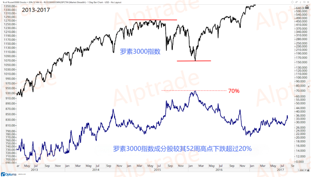 我认为2015–2016年的例子更合适。在这个案例中,时间因素得到了体现。许多股票在2014年第四季度见顶(包括道琼斯运输平均指数),到2016年初时,罗素3000指数中有超过70%的股票距离52周高点下跌了超过20%。这种“广泛参与”才是我们用来定义趋势的标准: