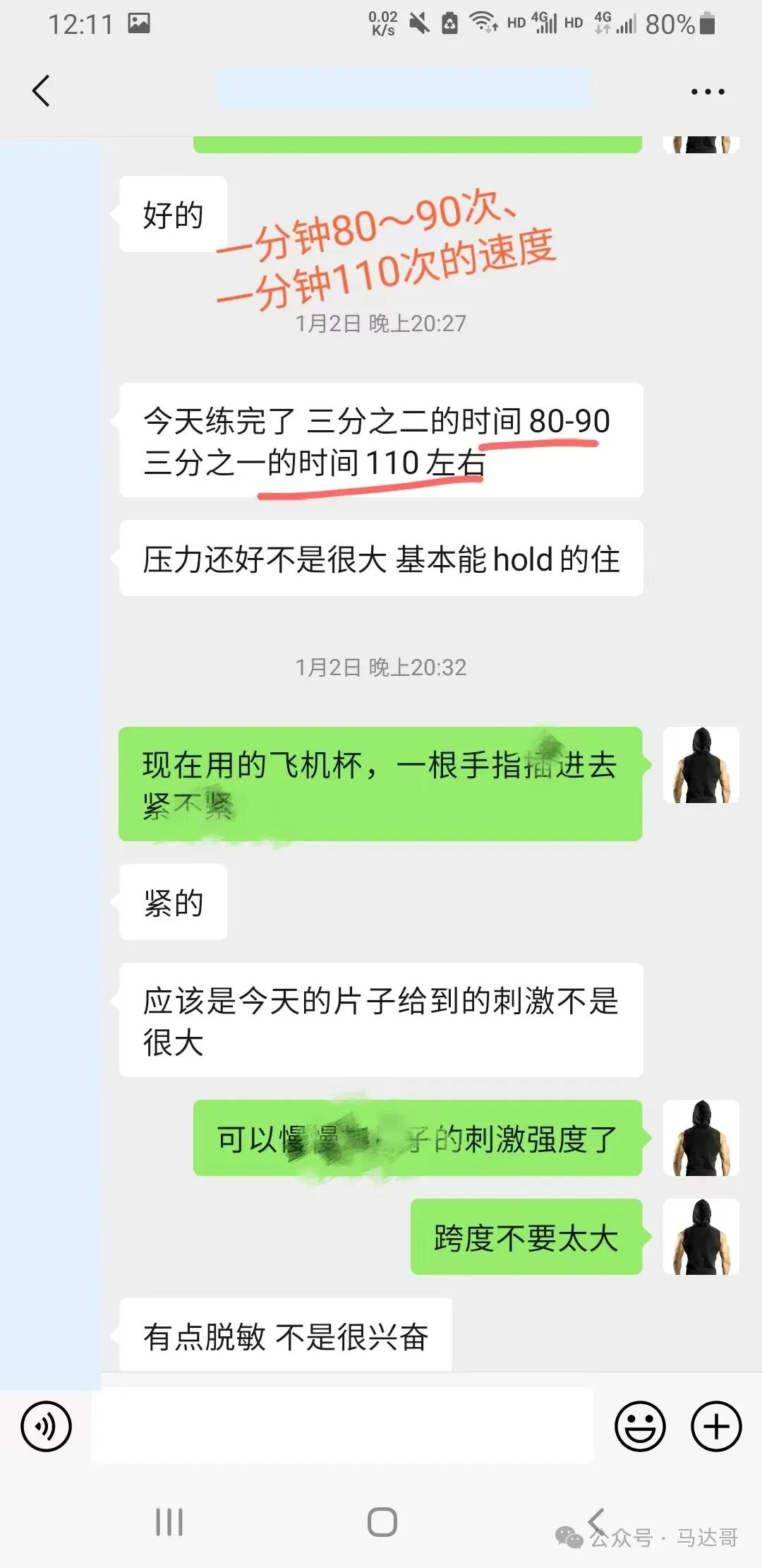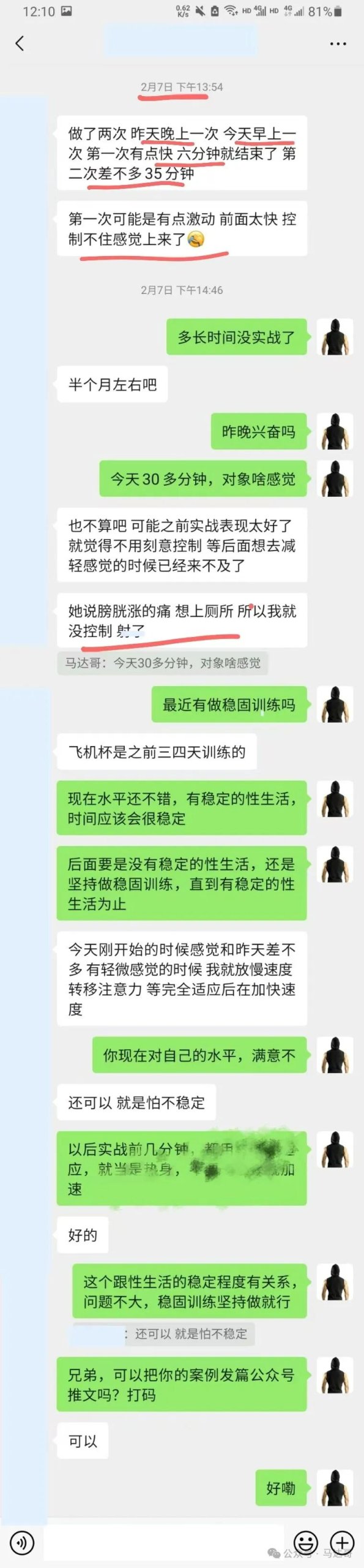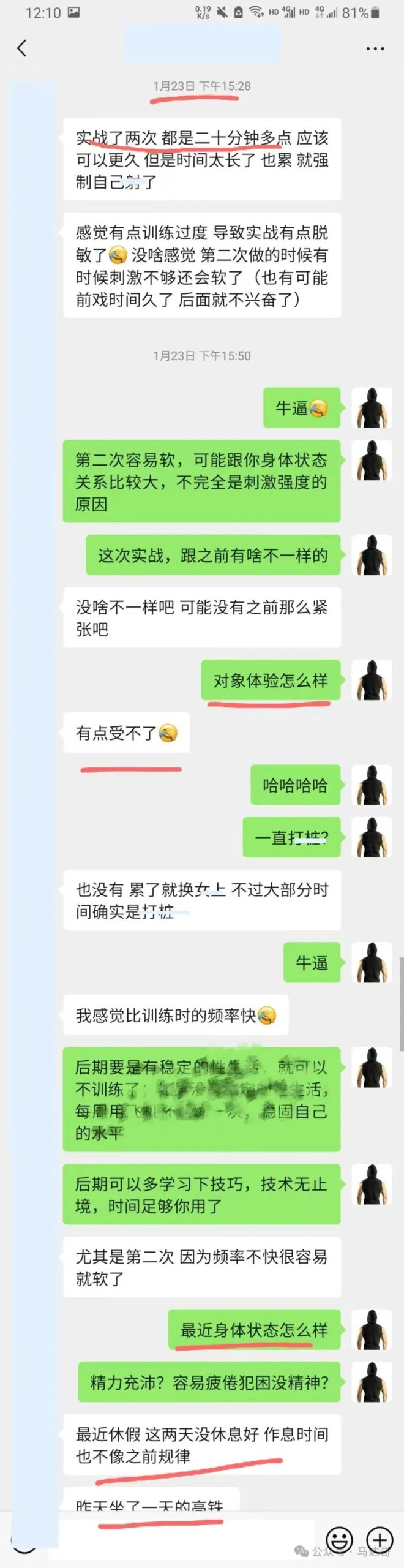【年龄】26岁【报名时间】2023年10月11日【训练时间】训练不到2个月【训练后水平】看片+飞机杯30分钟无压力【训练后实战】下文有各个部分的截图第一次反馈,24年1月23日,20分钟+第二次反馈,24年2月7日,最长35分钟
