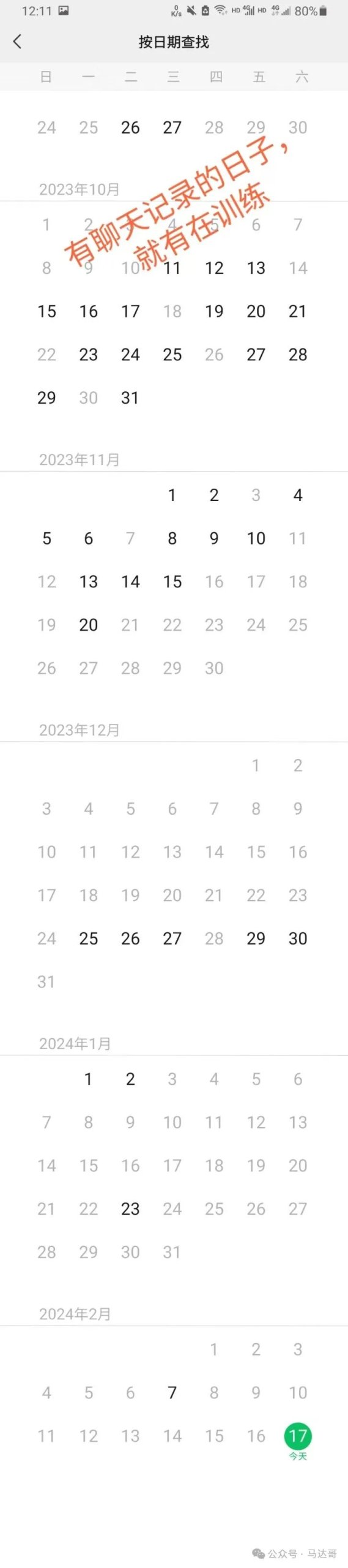 要求学员每次训练结束,都来向我反馈,下方有聊天记录的日子,该学员都有训练,不到2个月,主要集中在23年10-11月。具体情况如下图,该图片可以上下滑动
