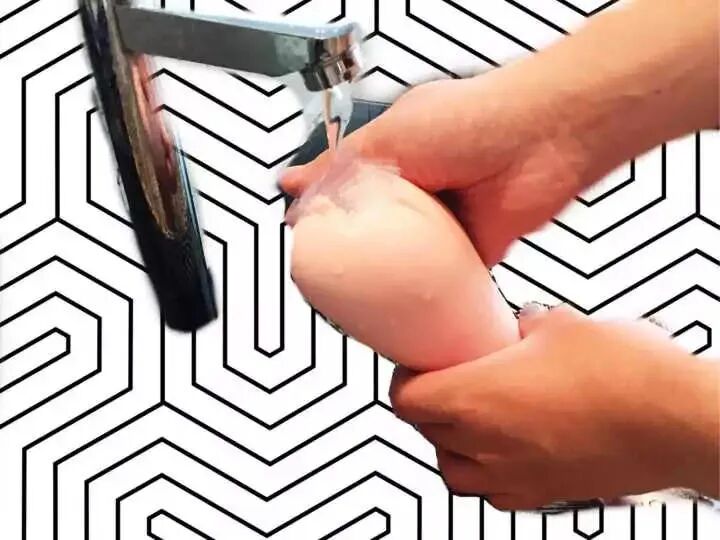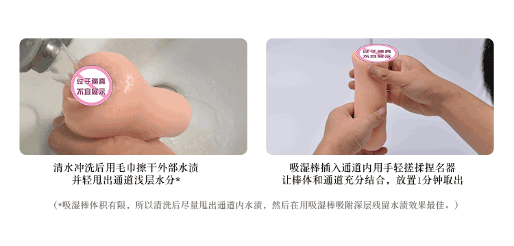 先用流水将玩具外部的润滑液清洗干净。然后用双手把玩具的入口扒开,打开水龙头,用水冲洗玩具通道内部。(这一步你将会目睹你的子孙被洪水无情冲走的惨状╮( ̄▽ ̄””)╭ 不过请不要怜惜 一定要冲干净!)