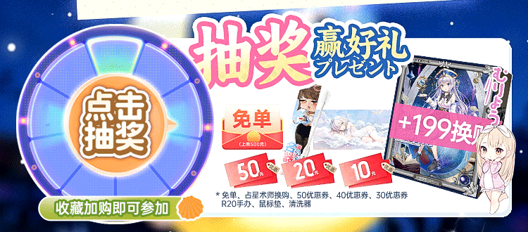 免单(上限500元)、30元优惠券、50元优惠券、40元优惠券、+199元换购星系术师、r20手办、白羽恋鼠标垫。实物奖品联系客服兑奖,随单发送,运费收到后退,不单独发货。