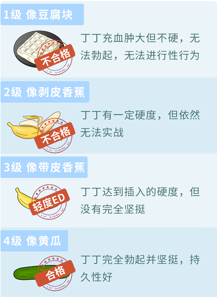 那么多硬才算正常?根据勃起硬度评分表,丁丁勃起时可以分为4个等级,等级1和2都属于不合格,等级4才是让人满意的硬度。