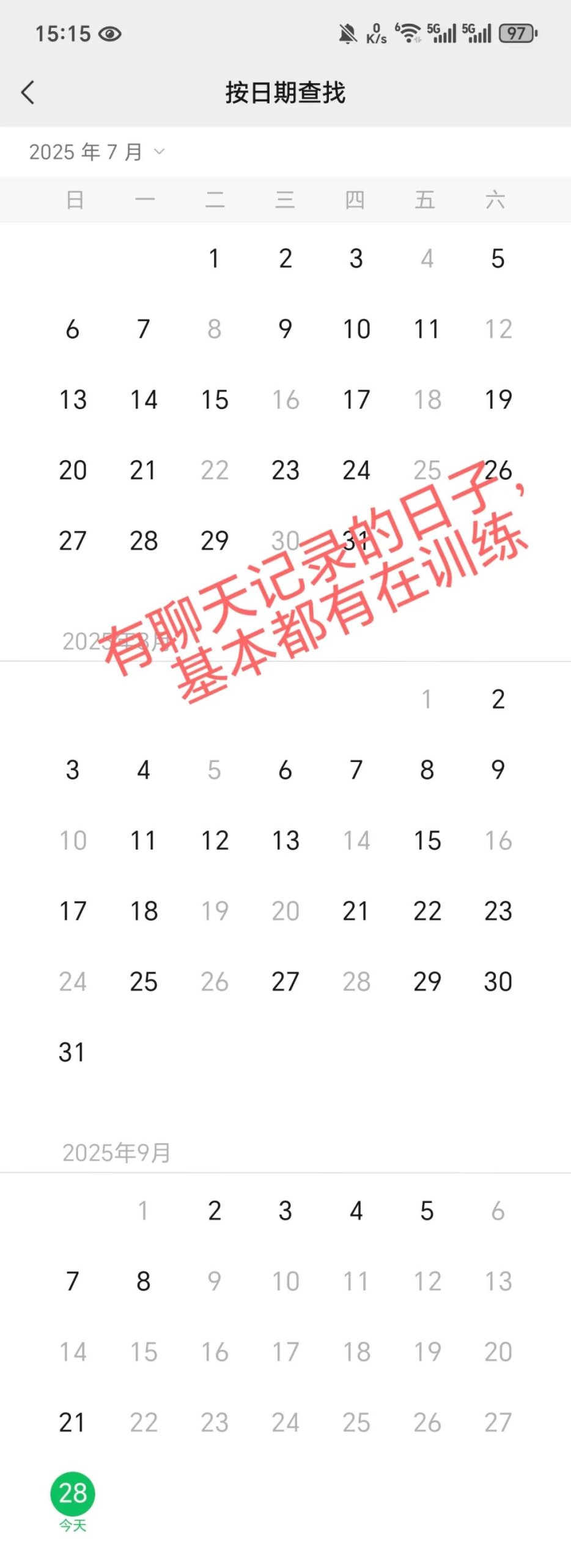 要求学员每次训练结束,都来向我反馈,下方有聊天记录的日子,该学员都有训练,训练集中在 7-8 月份。具体情况如下图,该图片可以上下滑动上下滚动查看更多四、训练水平