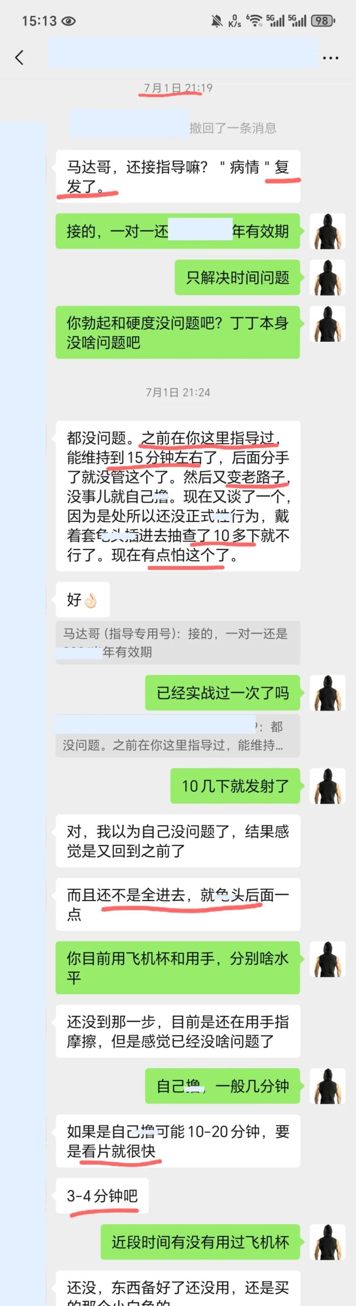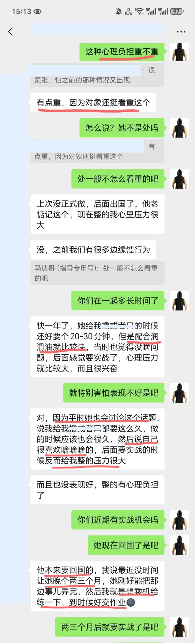 一、训练前的咨询2021 年底找我训练过,当时训练完能 15 分钟左右,分手后这几年空窗期有用手的习惯;和现女友在一起近一年,异国恋,尝试过实战,10 多下就结束了,今年 7 月 1 号再次报名训练;大概情况:23岁,实战 10 多下结束,心理负担很重,对象要回国了,打算训练准备一下。下面附上长截图,该图片可以上下滑动上下滚动查看更多二、训练后的实战