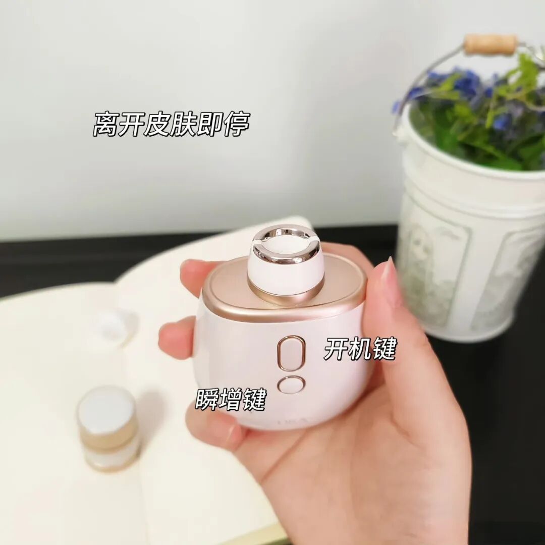 外形设计很巧妙,就是一个香水瓶的样子,特别低调。珠光白配香槟金,看起来既简单又高级,一点都不张扬。放在化妆包或者床头柜上,出门旅行带着也很方便。机身厚度适中,大小刚好,不管是拿在手里还是夹在腿间都挺合适的。顶部的无极旋钮既是遥控器,又能当防尘盖,保证了吸吸口的干净。