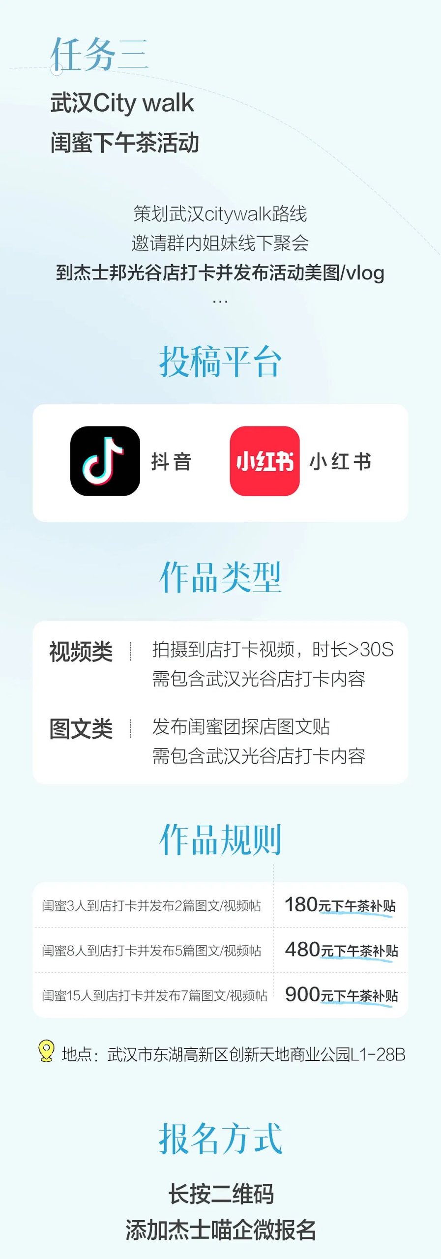 1、打卡路线:姐妹组队参与同城下午茶活动,并前往杰士喵武汉光谷店打卡;