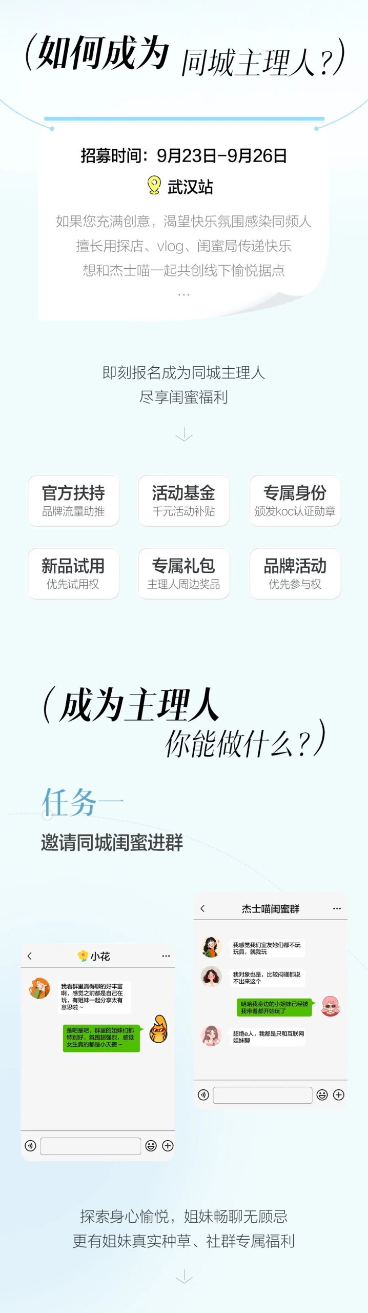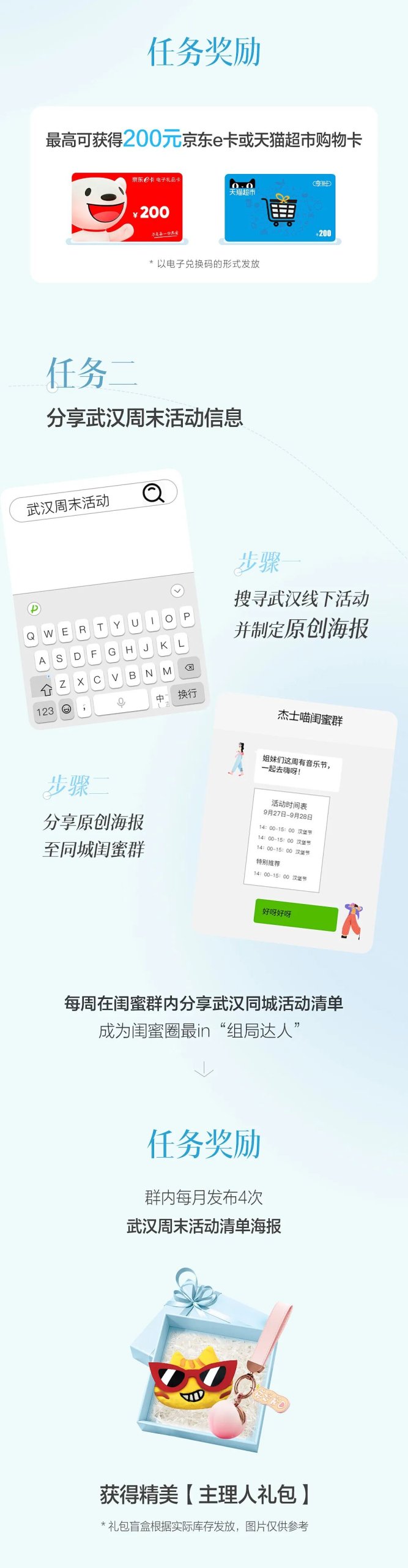 收集武汉线下活动信息,以图文的形式每周四分享至杰士喵武汉闺蜜群,当月分享次数≥4次即可领取主理人礼包,分享的图文需原创,不可直接转载(转载非原创内容需个人承担风险且不纳入奖励计算)