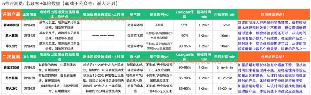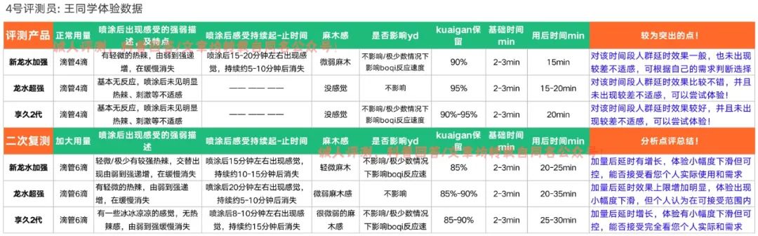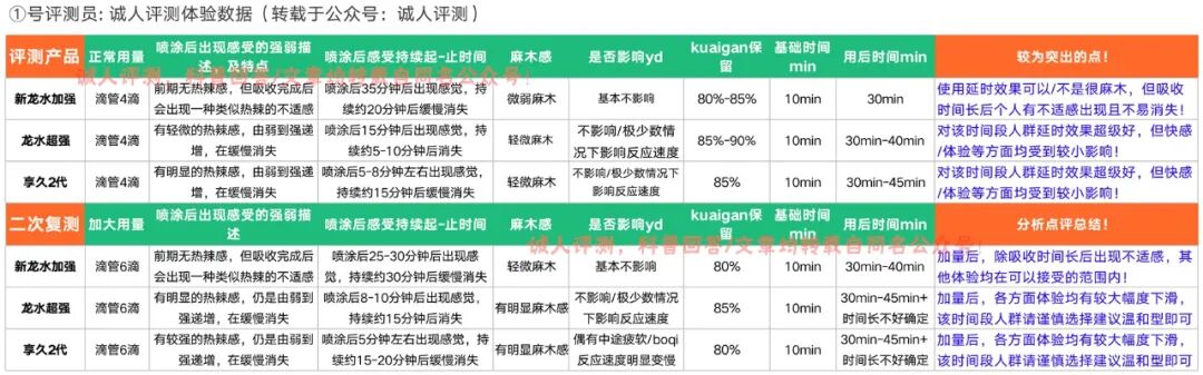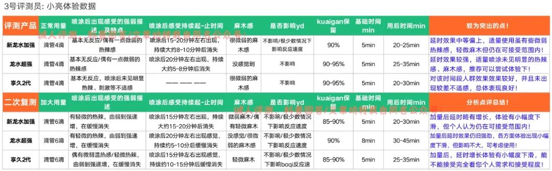 (这里要注意:延时效果≠体验,延时效果/效果通常指的是延长时间,而体验则是包含:用后热辣感、麻木感/快感保留、舒适度等)