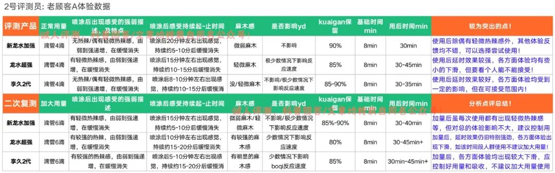为了得出真实体验反馈以及数据的准确性,咱们会继续给使用过龙水超强、享久2代的部分朋友发送试用装。让朋友们体验该两款产品在延时效果和体验上,同龙水超强和享久2代有何区别,以及优缺点,不过下次更新因为测试/整理数据比较繁琐,预计可能时间会稍微长一点,请您耐心并多多理解!