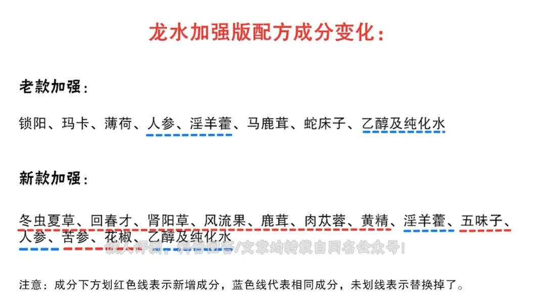 经咱们测试,龙水经典版延时效果一般,而这期重点是介绍同享久2代延时效果、体验相近的产品,所以暂时忽略龙水经典版。重点对比展示新龙水加强版,龙水超强版,下面展示新款龙水加强版—古方龙水和老款龙水加强的配方成分变化。
