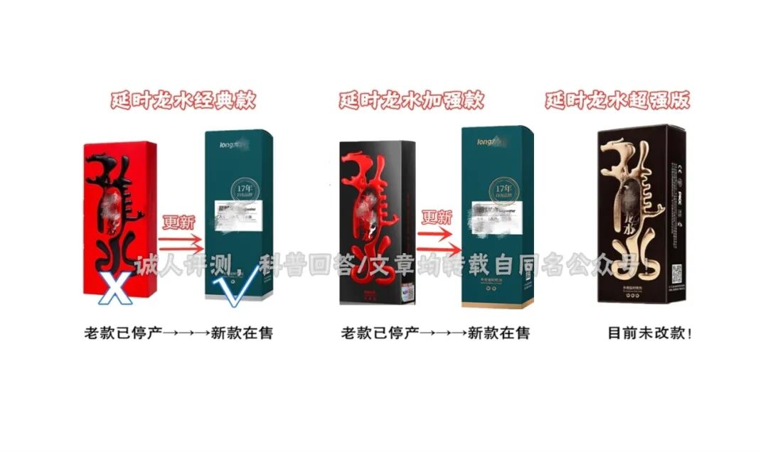这里注意:延时龙水经典款(原红色包装),经典款改款后称之为新龙水经典款—古方龙水经典款。延时龙水加强款(原黑色包装)改款后可以称之为 ” 新款龙水加强 — 古方龙水加强款 “。