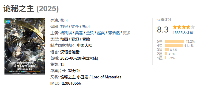 从动画完结后的客观数据来看,豆瓣8.3、IMDb 8.7。