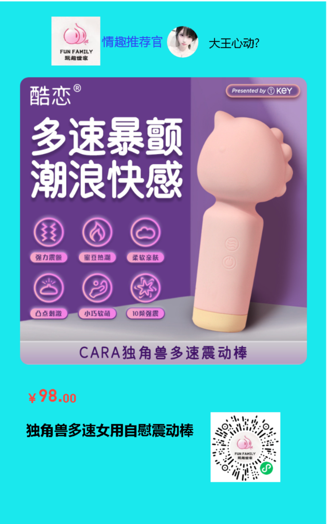 首先是这款独角兽玩具,别看它就像是一页锁精环,其实它是锁精+震震的模式,男女独自单独使用也很有料。