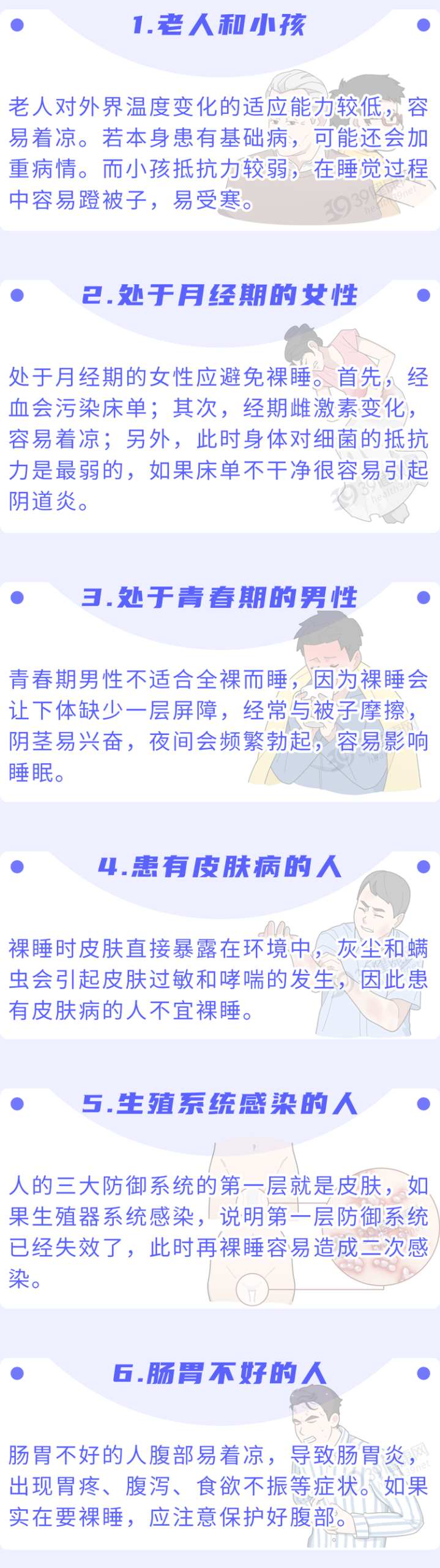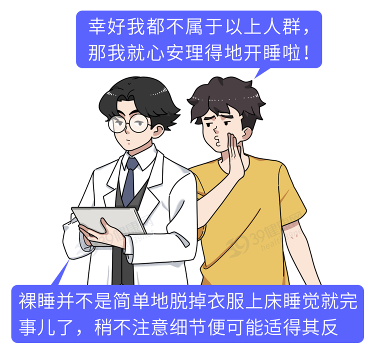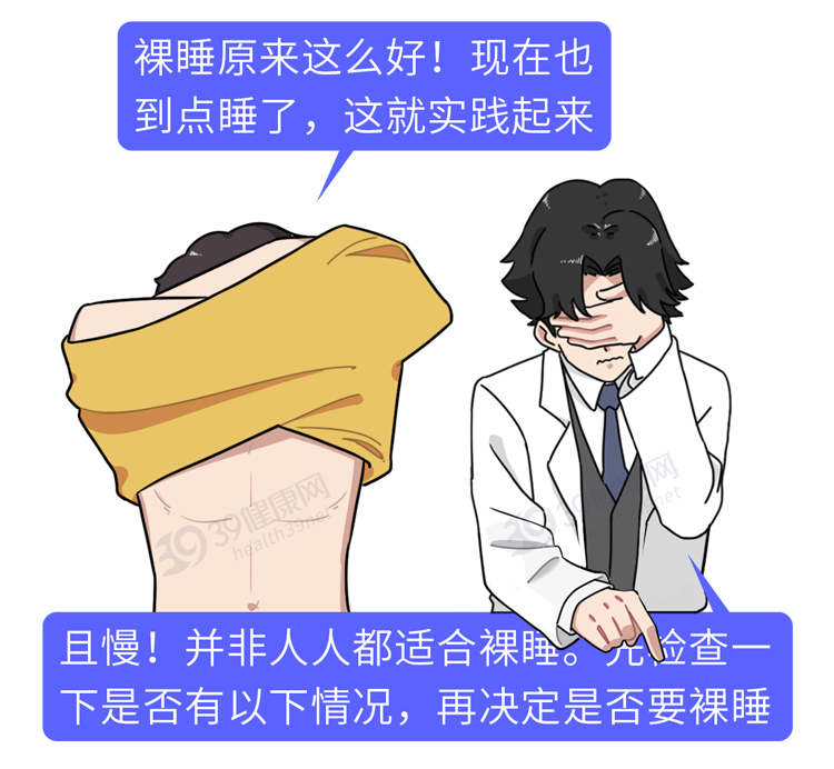 裸睡不一定要全裸,冬天可穿一件上衣保暖。夏天若需要开空调,则要避免使用凉席,防止“外感风邪”从而引起众多症状和疾病。
