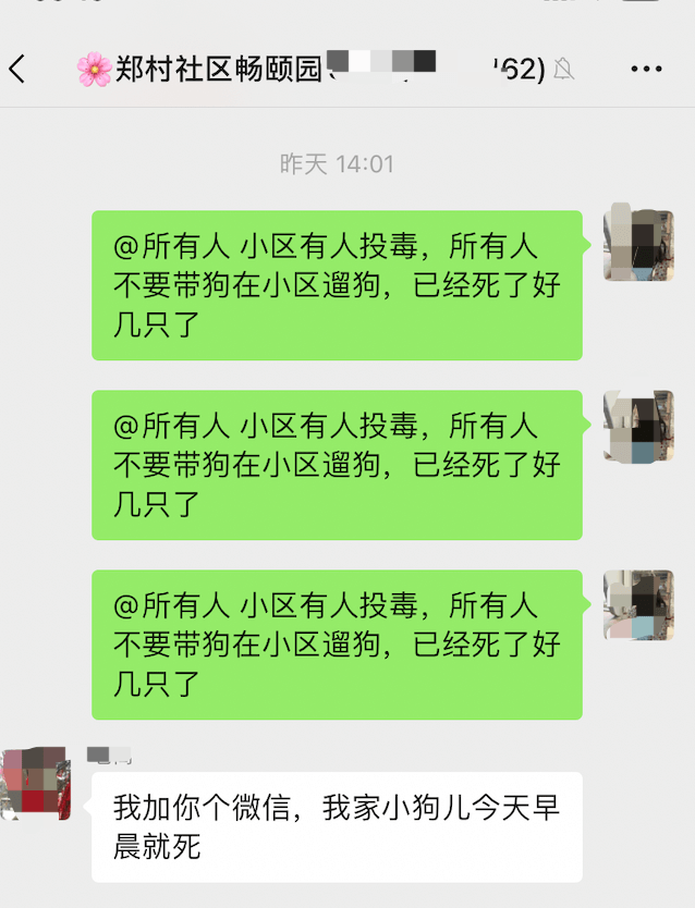 那一天,小区内有11只宠物狗中毒,其中9只死亡,另有两只流浪猫死亡。