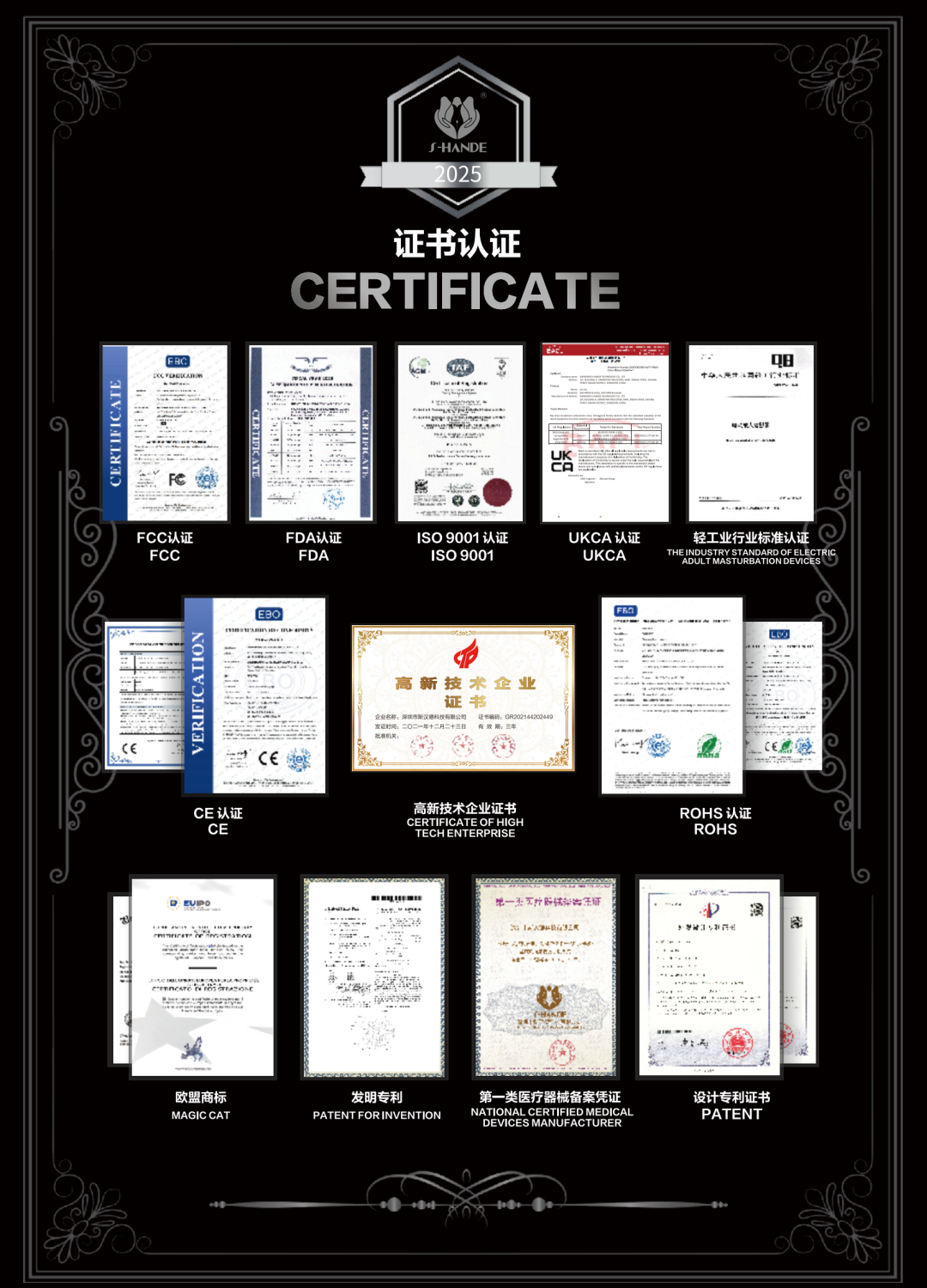为保障产品的高品质,斯汉德严格执行国际IS09001与IS013485认证体系质量管理体系。并为符合世界各国进口产品质量要求,我司产品坚持严格的第三方检测,并获得欧洲CE,ROHS,无线产品CE-RED认证,美国FDA医疗食品部认证,SGS,UN38.3认证等,国内一类医疗器认证和3C认证。