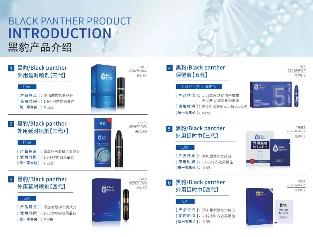 黑豹品牌创立18年以来,一直专注于成人两性健康产品的研发、生产及销售,旗下产品覆盖延时喷剂、延时湿巾、润滑液、安全套等男女私护健康产品。凭借着优良的产品体验和服务理念,多年来在业内赢得诸多良好信誉。