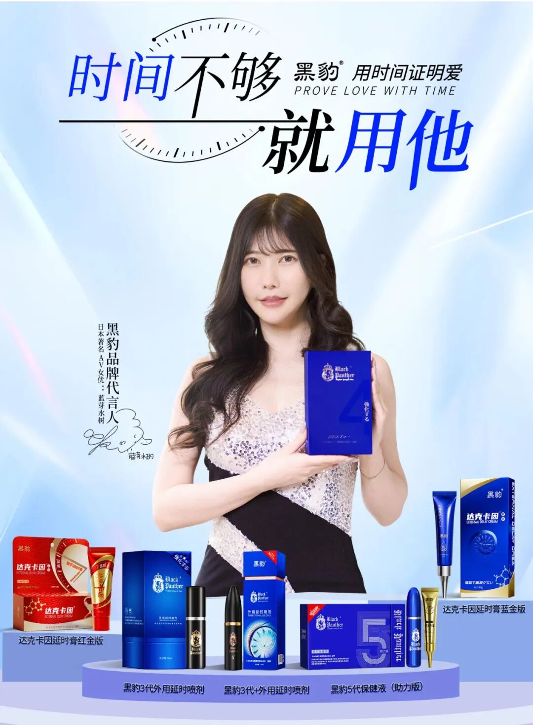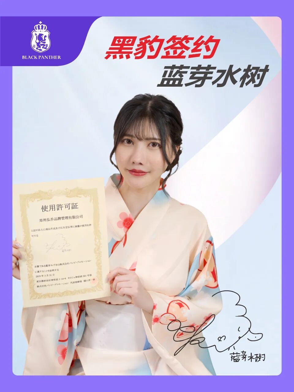 黑豹品牌继签约”乃木莹、“椿梨香”等片场著名女星合作后,2025年正式签约全新产品代言人:蓝芽水树(曾用名:蓝芽水月、蓝芽美月等),开启全新幸福之旅。