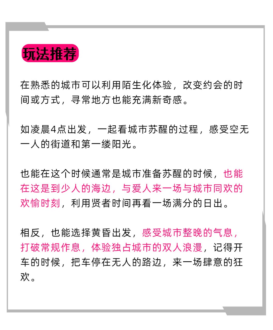 其实不管是在户外还是在家里,新鲜感其实是双方共同维持的!并且不能把双方之间维持情感的小把戏当成任务,而是把它形成习惯,这样每一次的约会都能充满期待和惊喜啦~