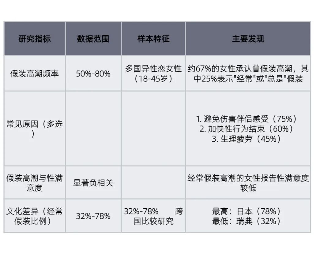 《性行为档案》期刊(2018)研究标题:”Why Women Fake Orgasms: A Qualitative and Quantitative Analysis”发现:75%的女性将”保护伴侣自尊”列为主要原因