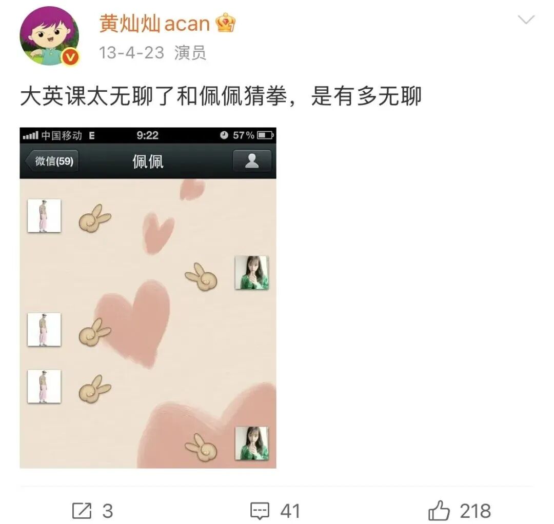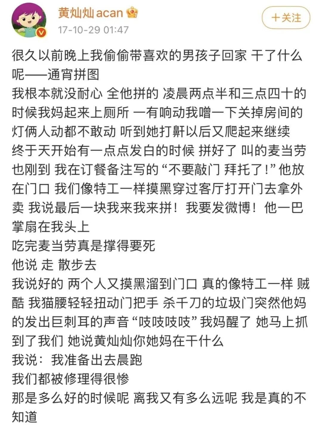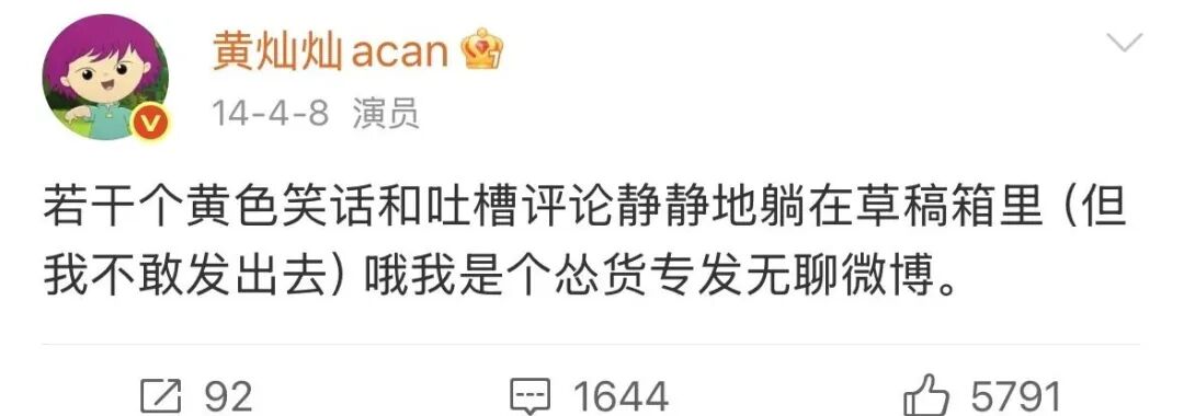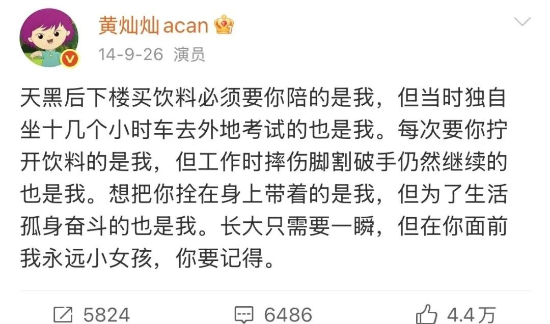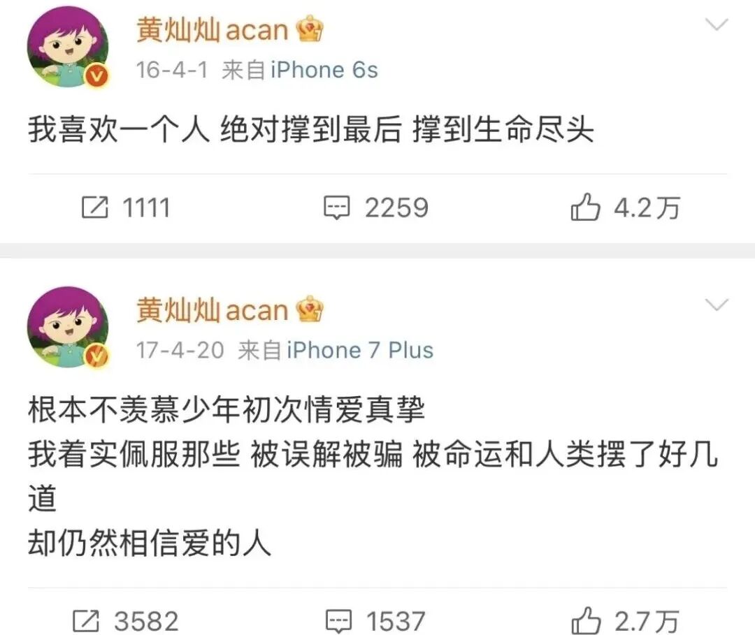 许多明星在成名后早年的动态隐藏起来,以保持完美的人设,但黄灿灿的微博,至今毫无保留地向公众敞开。