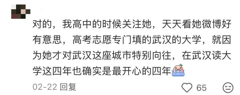 因为每天追更她的微博,有网友对武汉心生向往,就连高考志愿,也专门填的武汉的大学。