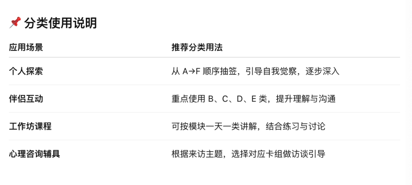 丰富内容+分类 —— 从99个签,变成138个签,7大分类,在抽出一签之后,不仅有提问,也有结构化的自我探索练习,让你能在亲密关系里更清晰地听见自己的声音。