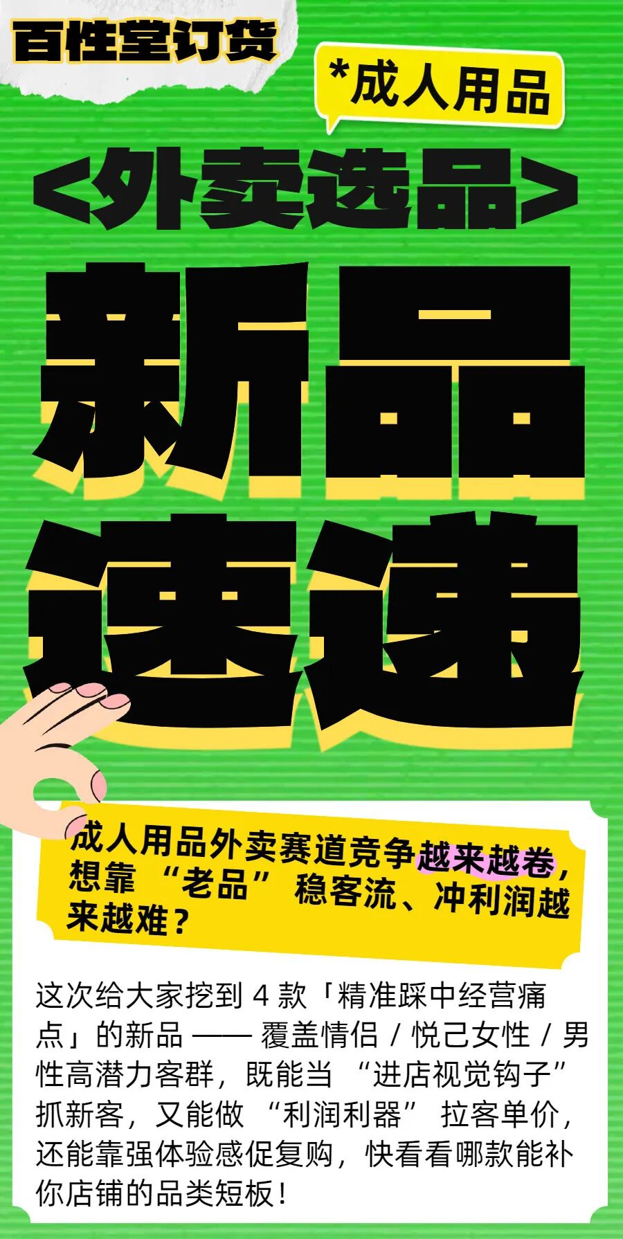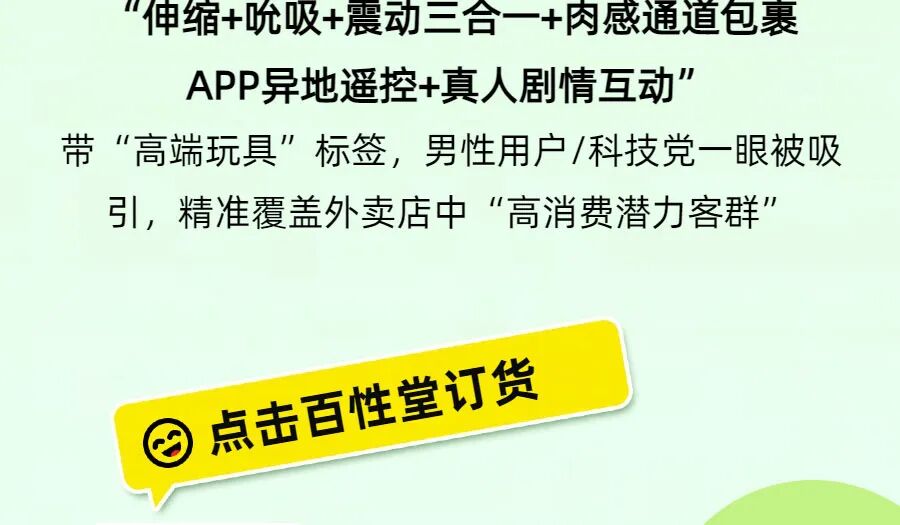成人用品外卖店选品指南:4 款宝藏新品,帮你引流量、提客单、促复购! 作者: 百性堂订货 声明:本文仅为产品使用指南与人物资讯,不含任何色情内容,不提供任何观看方式,不涉及非法信息。如若本站内容侵犯了原著者的合法权益,可联系我们进行处理。