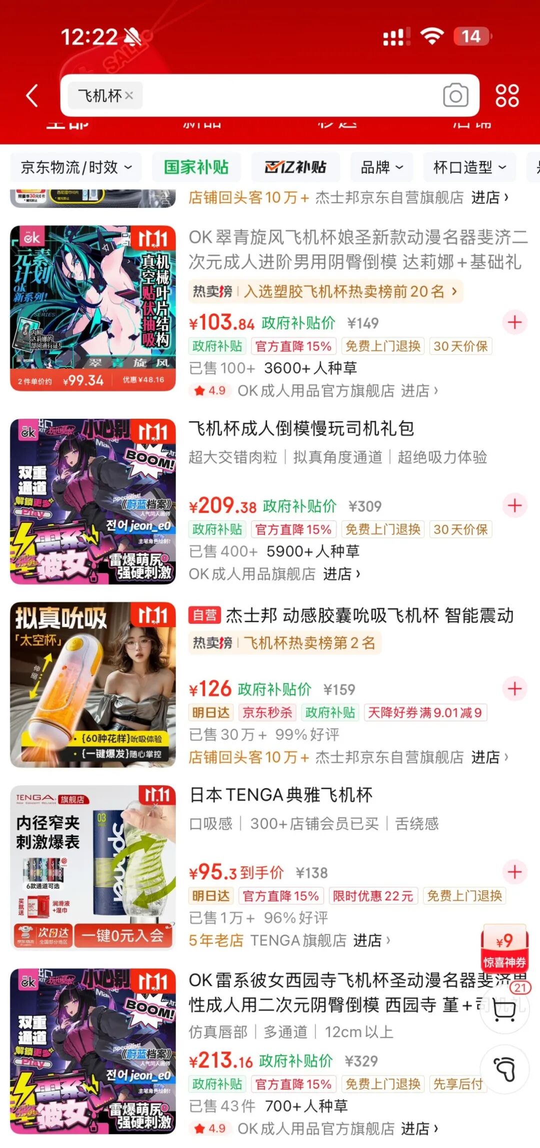 事情的起因是:这几天,被群友的“飞机杯领国补”的内容刷屏了。原本我以为是假的,因为我印象中成人用品是不在国补清单里的,怀着好奇的心态,小编打开了京东APP,一看究竟。