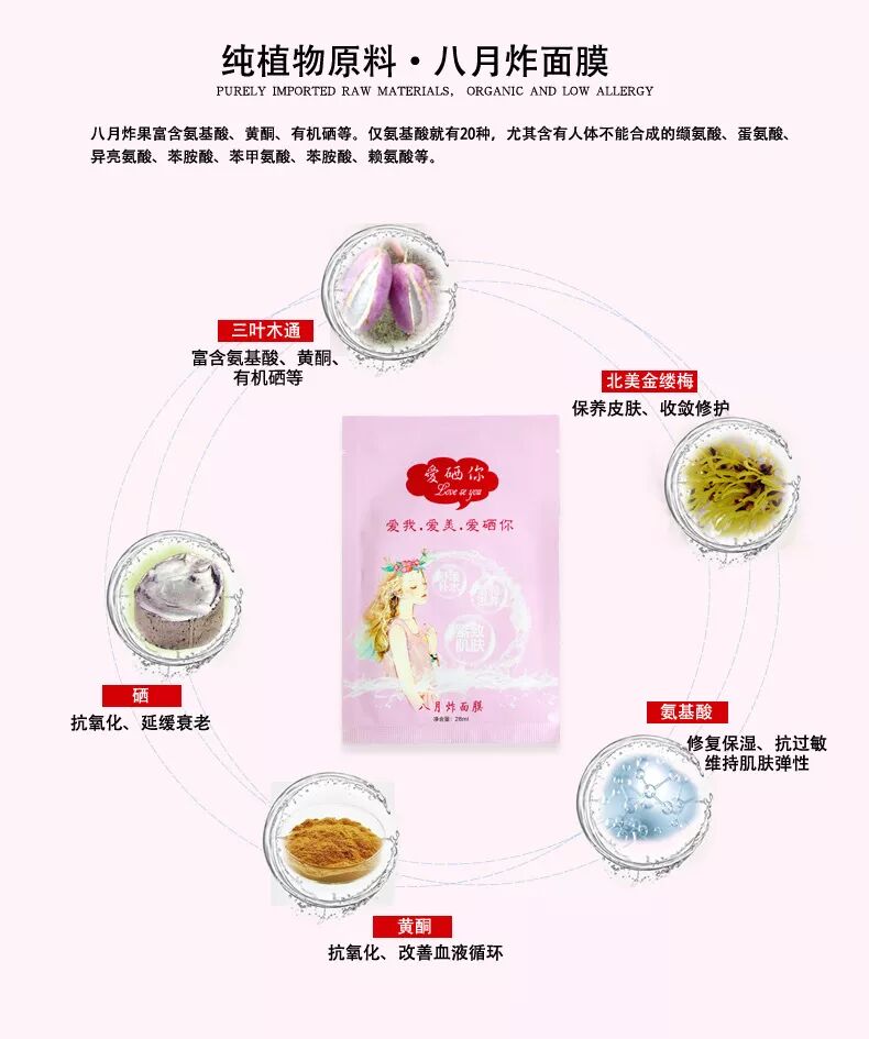 爱硒你面膜以八月炸为原料,采用纯植物配方,温和滋养,提取鲜果有效成分能够补水保湿,呵护肌肤。