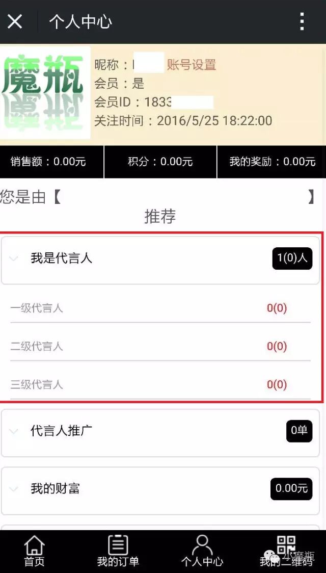 在2016年7月26日——8月26日期间,凡是推荐自己的朋友扫自己的二维码进入“魔瓶商城”并成功关注的,每推荐一个朋友奖励5积分,积分可以当现金使用来购买产品,积分赠送无上限。