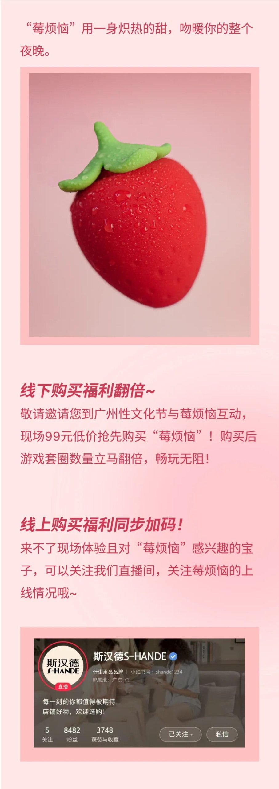 有礼 |「莓烦恼」广州成人展首发!被猛吸一口的甜蜜暴击! -END- 作者: S-HANDE斯汉德 声明:本文仅为产品使用指南与人物资讯,不含任何色情内容,不提供任何观看方式,不涉及非法信息。如若本站内容侵犯了原著者的合法权益,可联系我们进行处理。
