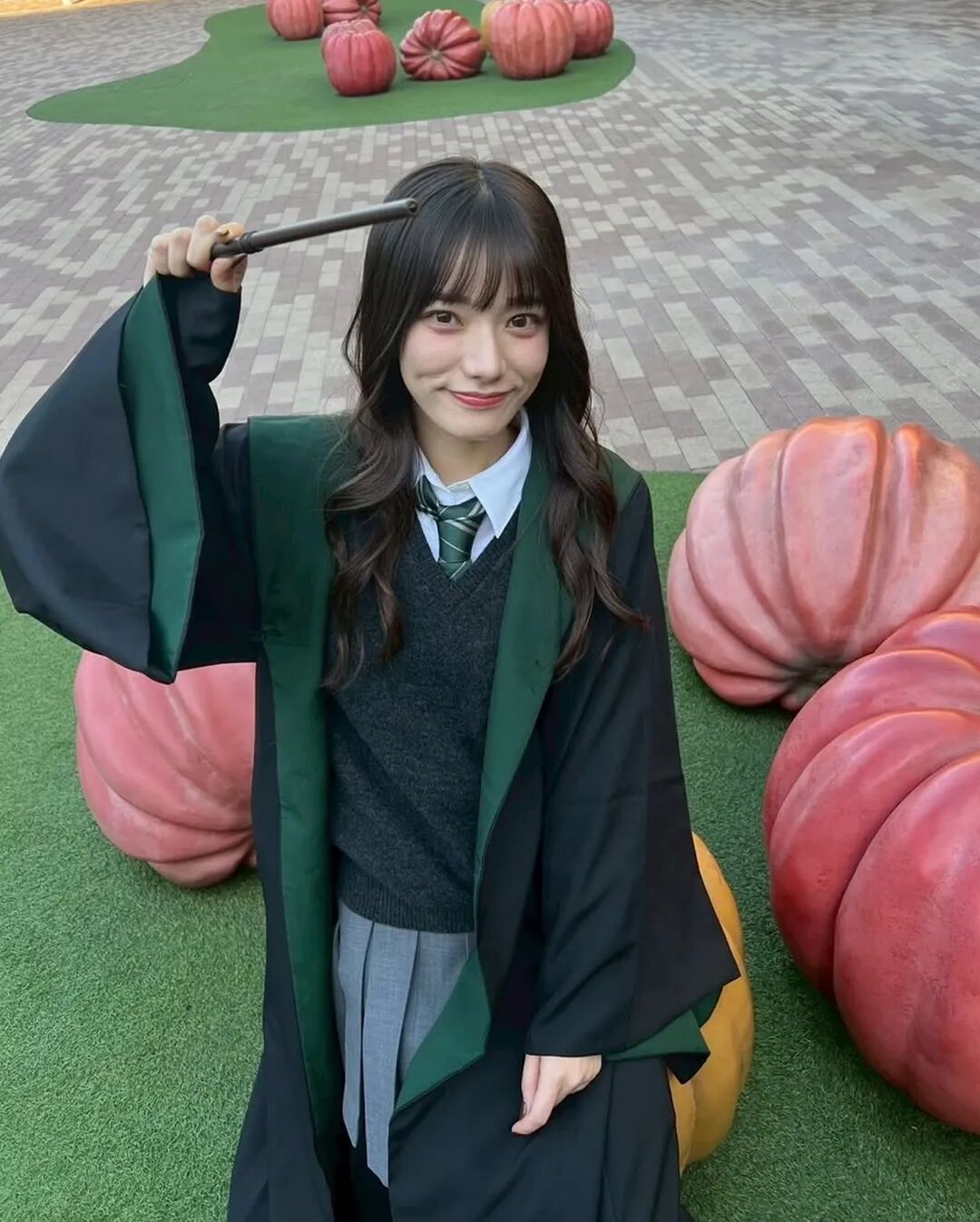 今年她的万圣节造型选择《哈利波特》主题,穿上史莱哲林制服,还特地晒出“马份魔杖”自拍。