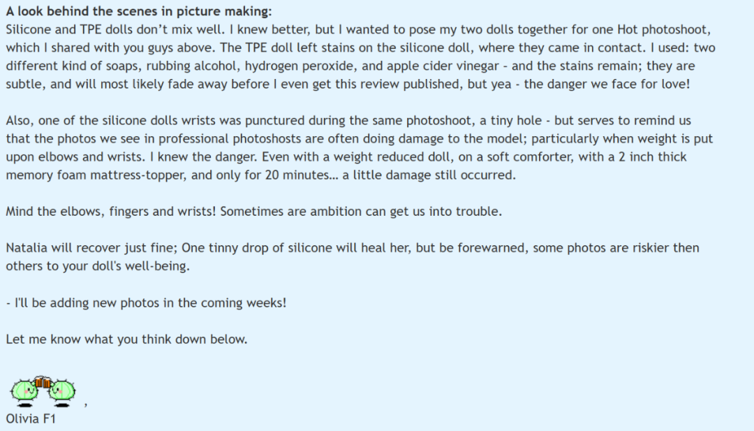 硅胶娃娃和TPE娃娃不能很好地共处。我本应更清楚这一点的,但我还是想让我的两个娃娃一起摆姿势来拍一些靓照,就是我上面和你们分享过的那次拍摄。TPE 娃娃在与硅胶娃娃接触的地方留下了污渍。我用了两种不同的肥皂、外用酒精、过氧化氢以及苹果醋来清洁 —— 但污渍依然还在;它们不太明显,而且很可能在我这篇评测发表之前就会慢慢褪去,但确实啊 —— 这就是我们为了追求理想画面而面临的风险!