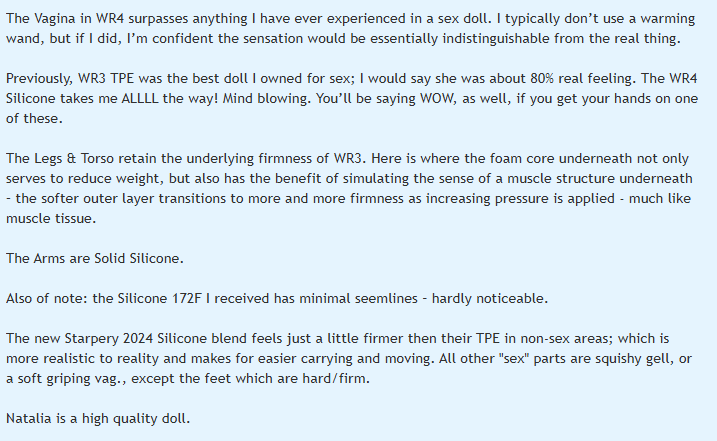 Starpery 2024 年的新型硅胶混合物在非私密部位感觉比他们的TPE材质稍硬一点,这更贴近现实情况,而且更便于搬运和移动。所有其他 “私密” 部位要么是柔软的凝胶材质,要么是触感柔软的下体部位,不过脚部是偏硬的。