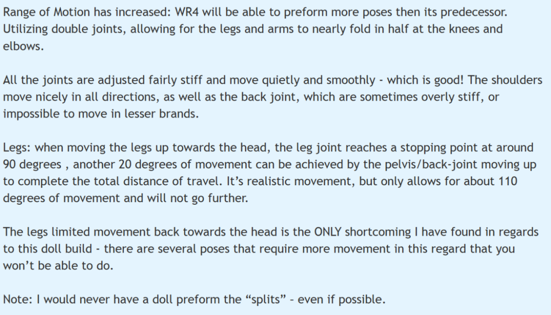 腿部朝头部方向的活动受限是我在这款娃娃构造方面发现的唯一不足之处 —— 有好几个姿势需要在这方面有更大的活动范围,而用这款娃娃是做不出来的。