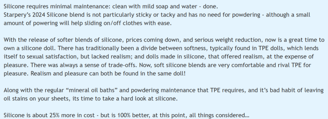 再加上TPE材质的娃娃需要定期进行“矿物油浴”以及扑粉保养,而且它还有在床单上留下油渍的坏习惯,是时候认真考虑一下硅胶材质的娃娃了。