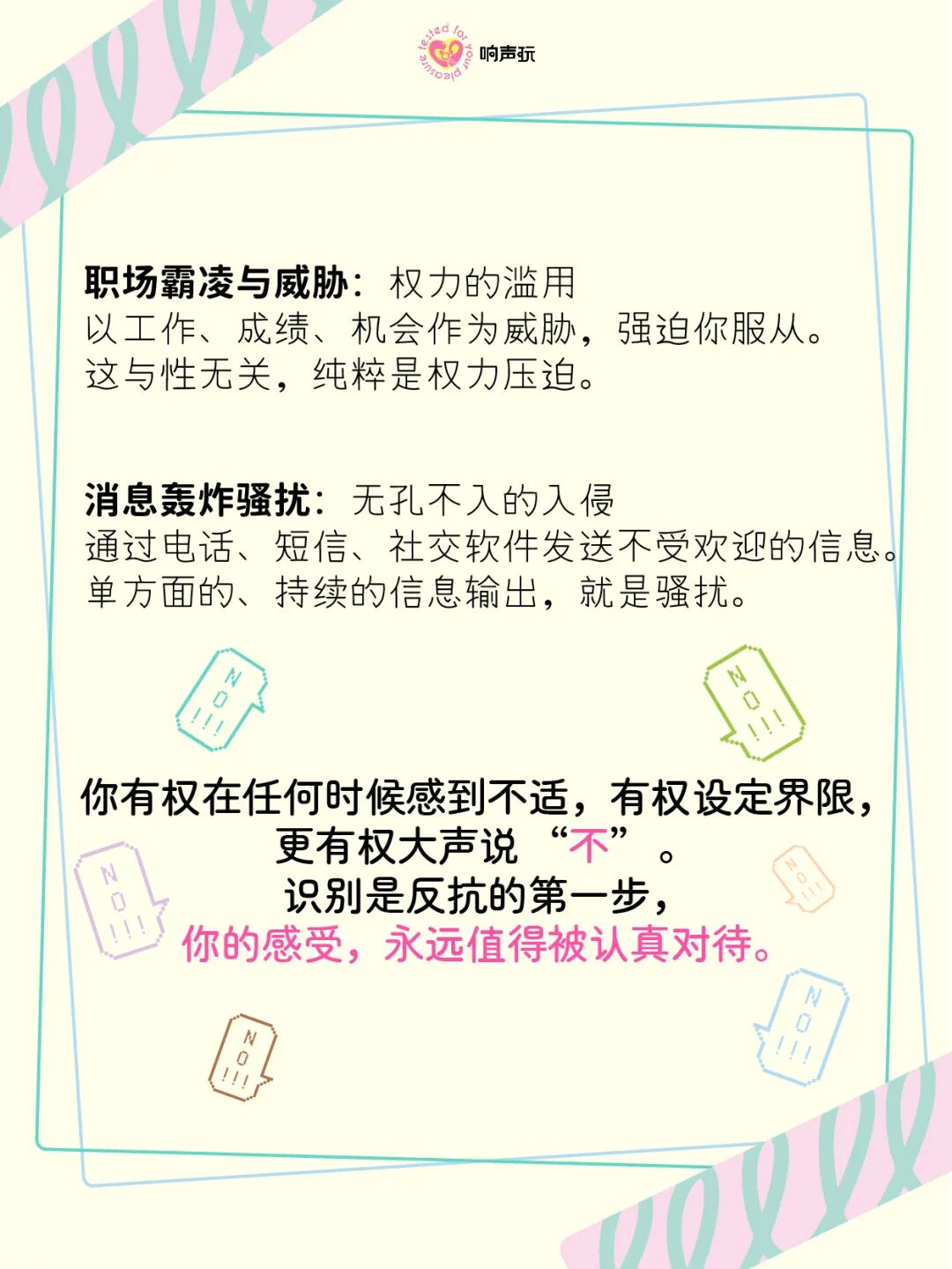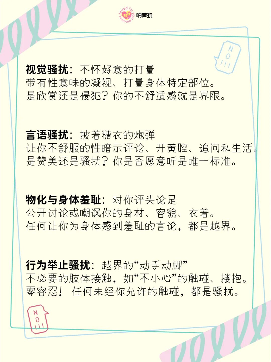 任何让你感到不适、恐惧与羞辱的越界行为都属于[性骚扰]。