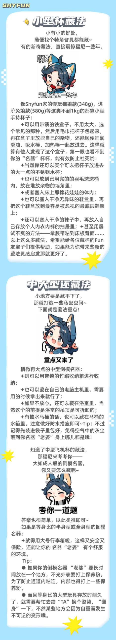 不同型号大小的飞机杯怎么藏最隐蔽? 作者: SHYFUN暖趣 声明:本文仅为产品使用指南与人物资讯,不含任何色情内容,不提供任何观看方式,不涉及非法信息。如若本站内容侵犯了原著者的合法权益,可联系我们进行处理。