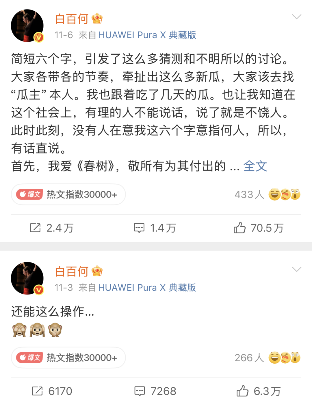 11月3日,白百何发出一条微博:“还能这么操作……”几小时后,本该在东京电影节为主演电影《春树》站台的她,提前返程北京。