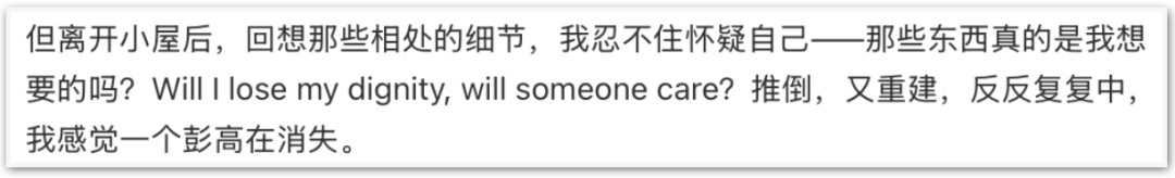真人秀不同于偶像剧的动人魅力正在于此:不是通过营造甜而完美的CP互动,粗制滥造工业糖精,而是借由个体性格、经历的复杂性,使得嘉宾们的行为难以被任何单一剧本所概括。故事的走向,由此变得扑朔迷离,却并不悬浮、虚假。
