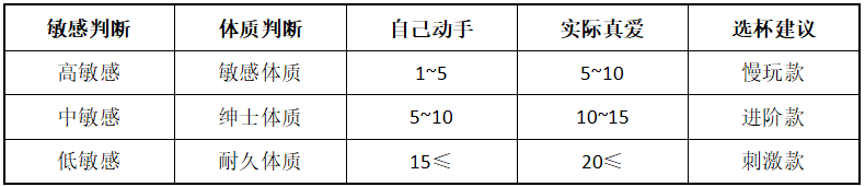 低敏感→刺激款→耐久体质定义:自己动手的时间通常情况在15分钟以上,实际真爱时间大概在20分钟以上。