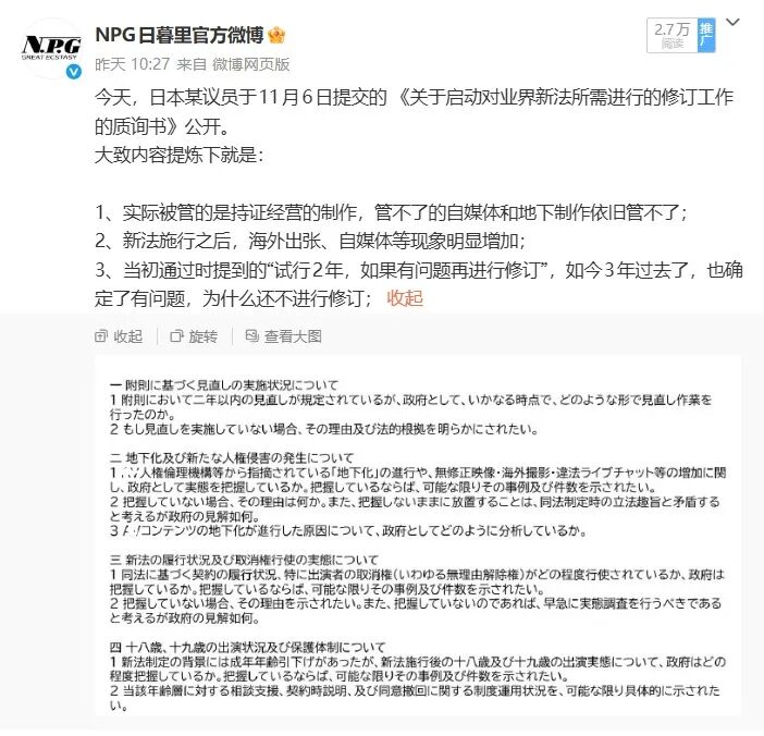 昨天看到日本众议院更新了第219回国会立法事项质询临时会放出来的质询与回答,其中第50条质询的内容就是《对业界新法修订的质询》。