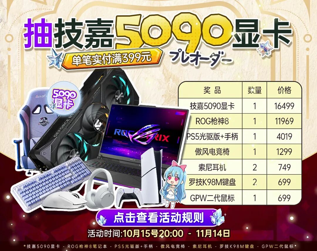 1.活动期间订单单笔实付满399元即可参与活动抽奖机会,每个id仅限获奖一次,预售订单符合的会计入在内,购物金充值订单不计入。
